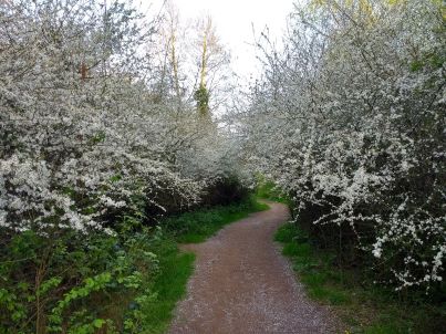 I find other revelations along the way – a stream I didn’t know was there (the Pin Brook) but must have passed right by many times. And on this mid-April day I see the striking juxtaposition of the hawthorn in spring with its young bright green leaves, next to the blackthorn with its snow-white flowers, but completely bare of leaves.